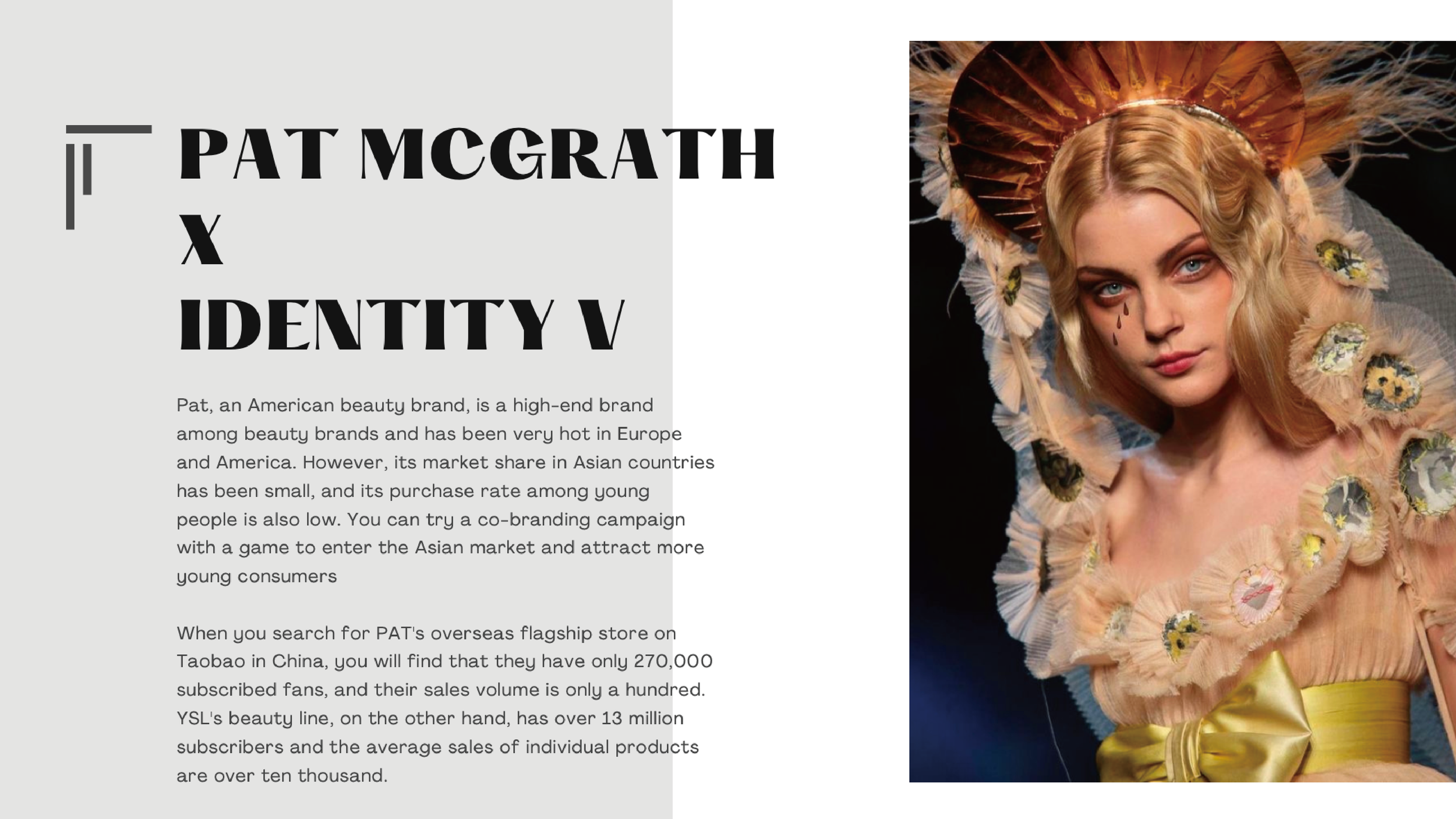 Pat McGrath, an American beauty brand, is a high-end brand among beauty brands and has been very hot in Europe and America. However, its market share in Asian countries has been small, and its purchase rate among young people is also low. You can try a co-branding campaign with a game to enter the Asian market and attract more young consumers